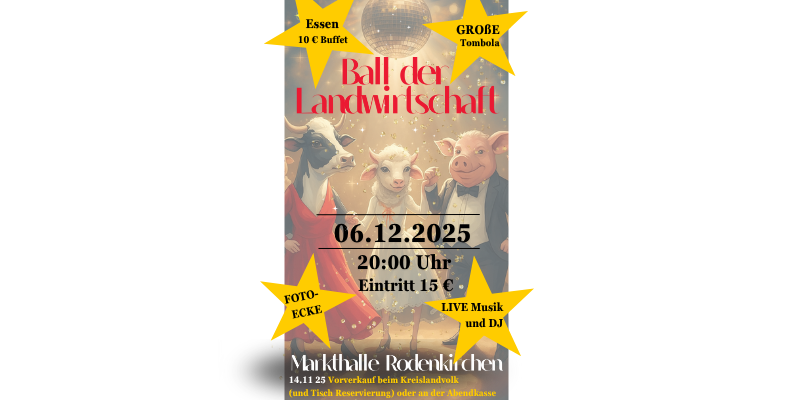 Am Sonnabend, den 06. Dezember 2025, findet der Ball der Landwirtschaft in der Markthalle Rodenkirchen statt. Beginn ist um 20:00 Uhr. In festlichem Rahmen werden an diesem Abend 23 Landwirtinnen und Landwirte, 5 Hauswirtschafterinnen sowie 7 Meisterinnen und Meister freigesprochen. Gemeinsam wird dieser besondere Meilenstein gefeiert – ein Abend voller Stolz, Freude und Gemeinschaft. Neben