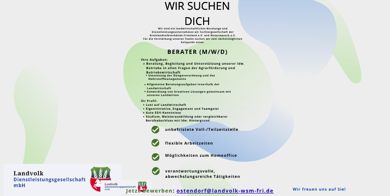 Der Kreislandvolkverband Wesermarsch ist die berufsständische Interessenvertretung der Landwirtinnen und Landwirte in der Wesermarsch. Wir haben mehr als 1700 Mitglieder und vertreten rund 90 Prozent der landwirtschaftlichen Betriebe im Landkreis. Wir geben der Landwirtschaft und dem ländlichen Raum eine Stimme – im Zusammenspiel mit Politik, Verwaltung, Verbänden, Wirtschaft und Wissenschaft. Auf unserer Website erfahren Sie mehr über unseren Verband, unsere Angebote und Dienstleistungen und über die Landwirtschaft in der Grünlandregion Wesermarsch.