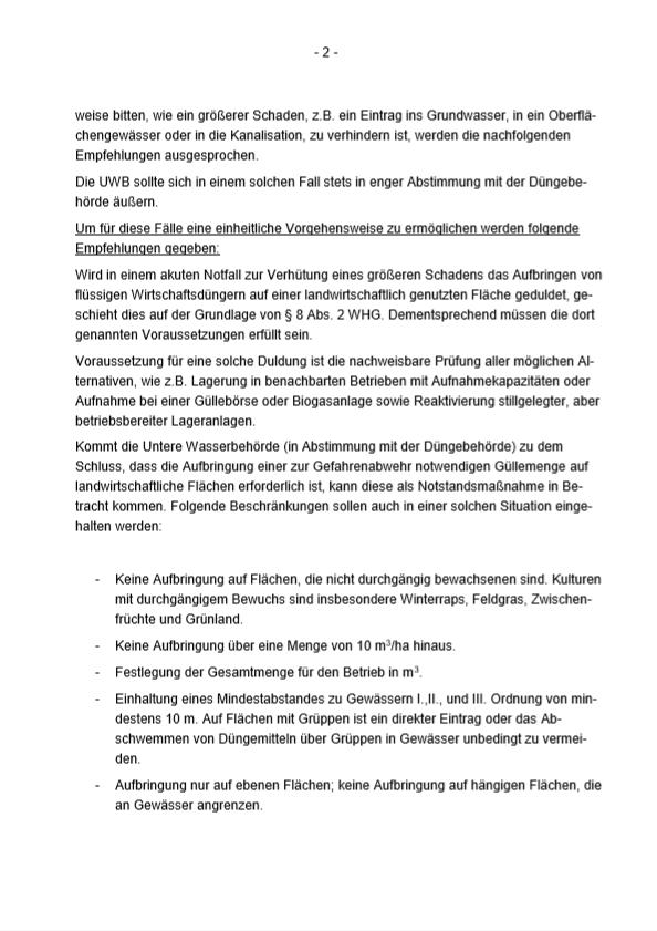 Es ist zu befürchten, dass die Kapazitäten zur Lagerung flüssiger Wirtschaftsdünger auf einzelnen Betrieben vor Ende der Sperrfrist weitgehend erschöpft sein werden. Ein Überlaufen oder Bersten der Lagerbehälter ist aus Umweltschutzgründen jedoch unbedingt zu verhindern. In derartigen Fällen besteht dringender Handlungsbedarf, um eine Gefährdung von Grund- und Oberflächengewässern zu verhindern.