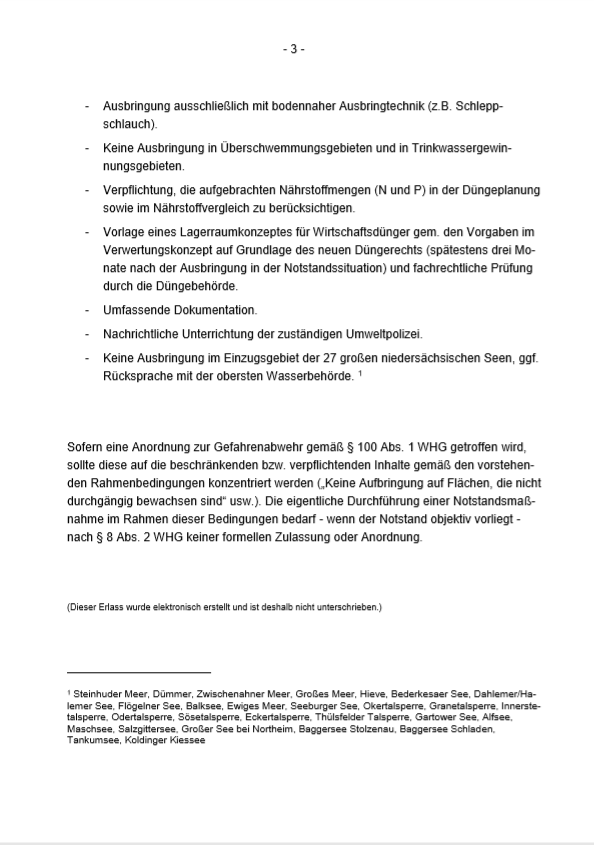 Eine derartige Ausnahme- bzw. Notfallsituation kann nur im Rahmen von Maßnahmen der unmittelbaren Gefahrenabwehr aufgelöst werden, um in einem derartigen Fall einen noch größeren Schaden (z. B. Einleitung ins Grundwasser, in ein Oberflächengewässer oder in die Kanalisation) zu vermeiden, der durch ein Überlaufen der flüssigen organischen Dünger und eine dadurch verursachte direkte oder auch indirekte Verunreinigung von Gewässern drohen würde. Nicht zuletzt gilt es auch strafrechtliche und prämienrelevante Konsequenzen zu vermeiden.