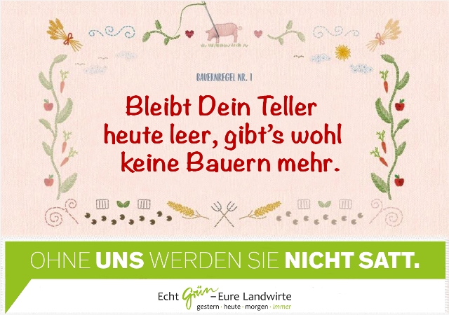 wir Landwirte sind Teil der Gesellschaft. Wir haben einen Versorgungsauftrag, den wir 365 Tage im Jahr erfüllen. Wir sind bei Wind und Wetter unterwegs und bei uns muss jeder mit anpacken. Ein Bauernhof ist immer ein Familienbetrieb, sieben Tage die Woche, 365 Tage im Jahr. Sie haben sicher auch mitbekommen, dass wir im letzten Jahr mit der Schweine- und Milchpreiskrise kein leichtes Jahr gehabt haben. Immer mehr Familienbetriebe in der Landwirtschaft müssen aufgeben. Wie müssen täglich den Spagat schaffen, zwischen immer größeren gesellschaftlichen Erwartungen an die Landwirtschaft auf der einen Seite und einer real schwierigen Marktsituation auf der anderen Seite. Dabei betrifft das Thema Landwirtschaft (und damit Ernährung) uns alle – uns Landwirte, die „Vermarkter“ und „Produktionsformen“ – und die Verbraucher. Da werden Sie uns sicher Recht geben. Deswegen sind das Unverständnis und der Ärger bei uns groß, wenn wir uns Ihre aktuelle Kampagne „www.neuebauernregeln.de“ anschauen. Neben der Tatsache, dass dort mit Steuergeldern ein Berufszweig diffamiert wird, passiert dies auch noch erst- und einmalig. Es kann sich keiner hier erinnern, dass es ähnliche Kampagnen z.B. über die Automobilwirtschaft gegeben hat. Nein, es sind wieder wir Landwirte, die zum Sündenbock gemacht werden.