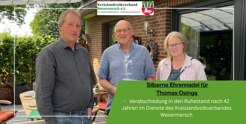 Die Nadel wurde von Dr. Karsten Padeken, 1. Vorsitzender des Kreislandvolkverbandes Wesermarsch, Manfred Ostendorf, Geschäftsführer des Kreislandvolkverbandes Wesermarsch, und Anne Vagt-Poelmann, Geschäftsführerin des Maschinenrings Wesermarsch, überreicht.